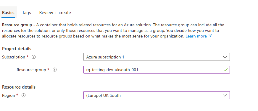 From Azure we will go to ‘Resource Groups’ ‘Create Resource Group’ and just give it an example name.