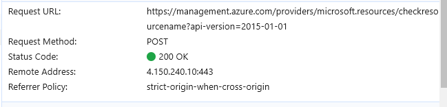 Once clicking ‘Review + Create’ you’ll see the first API request that your browser makes, which is just checking that you can create this resource. This isn’t what we are after, but it’s a good to know.