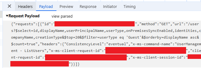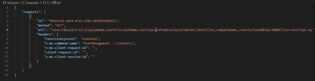 You can see here that the payload contains a list of requests (In this case just 1) and you can see in the URL is the same as Graph API’s URL to get users, just without the first part of the URL.