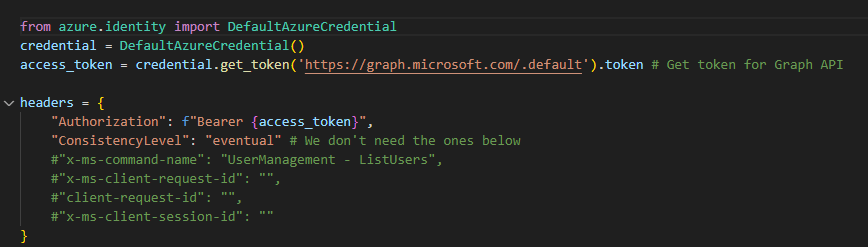 Now we are going to quickly implement the authentication, I will be using DefaultAzureCredential (Standard way to authenticate to Azure) and we will add the authentication token to the headers